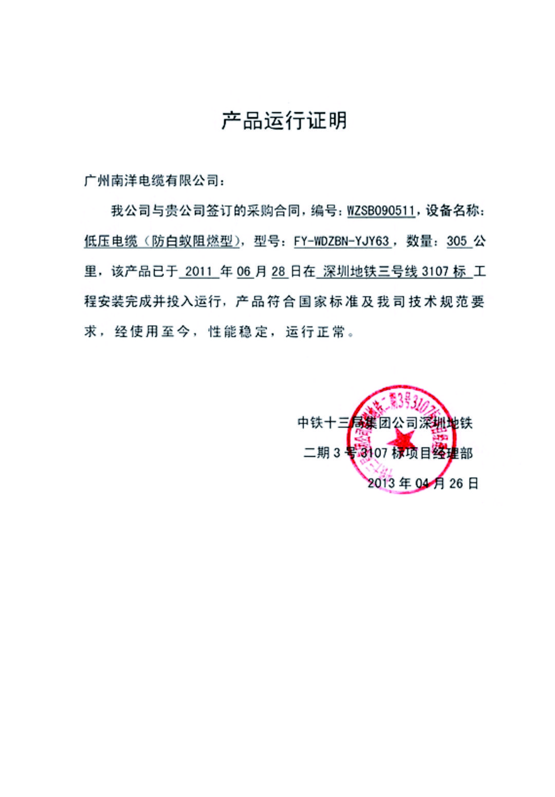 深圳地铁三号线3107标产品运行证明