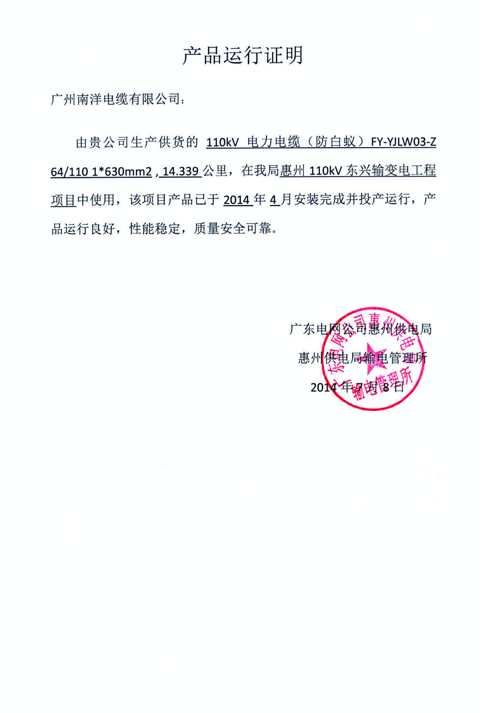 惠州110kv东兴输变电工程项目产品运行证明