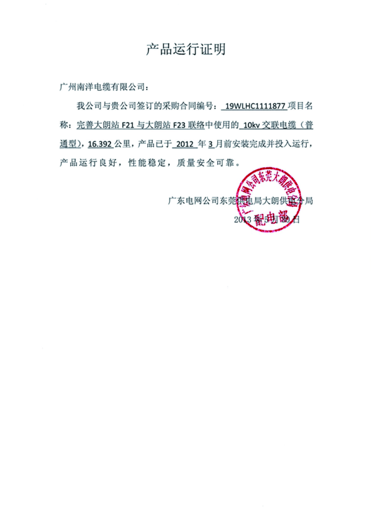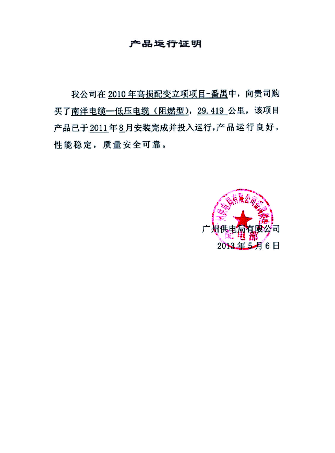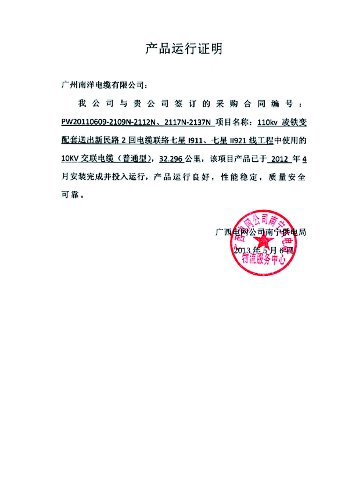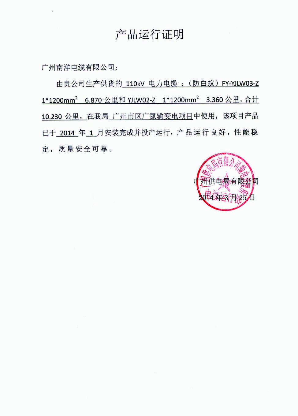 广州市区广氮输变电项目产品运行证明