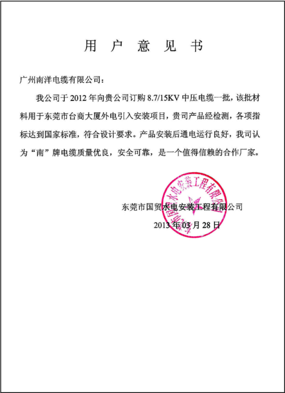 东莞国贸水电用户意见书