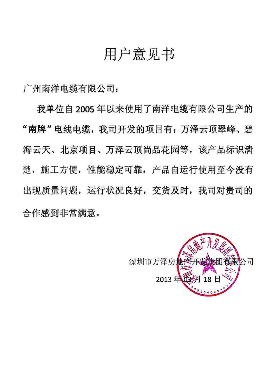 深圳市万泽房地产开发集团有限公司用户意见书