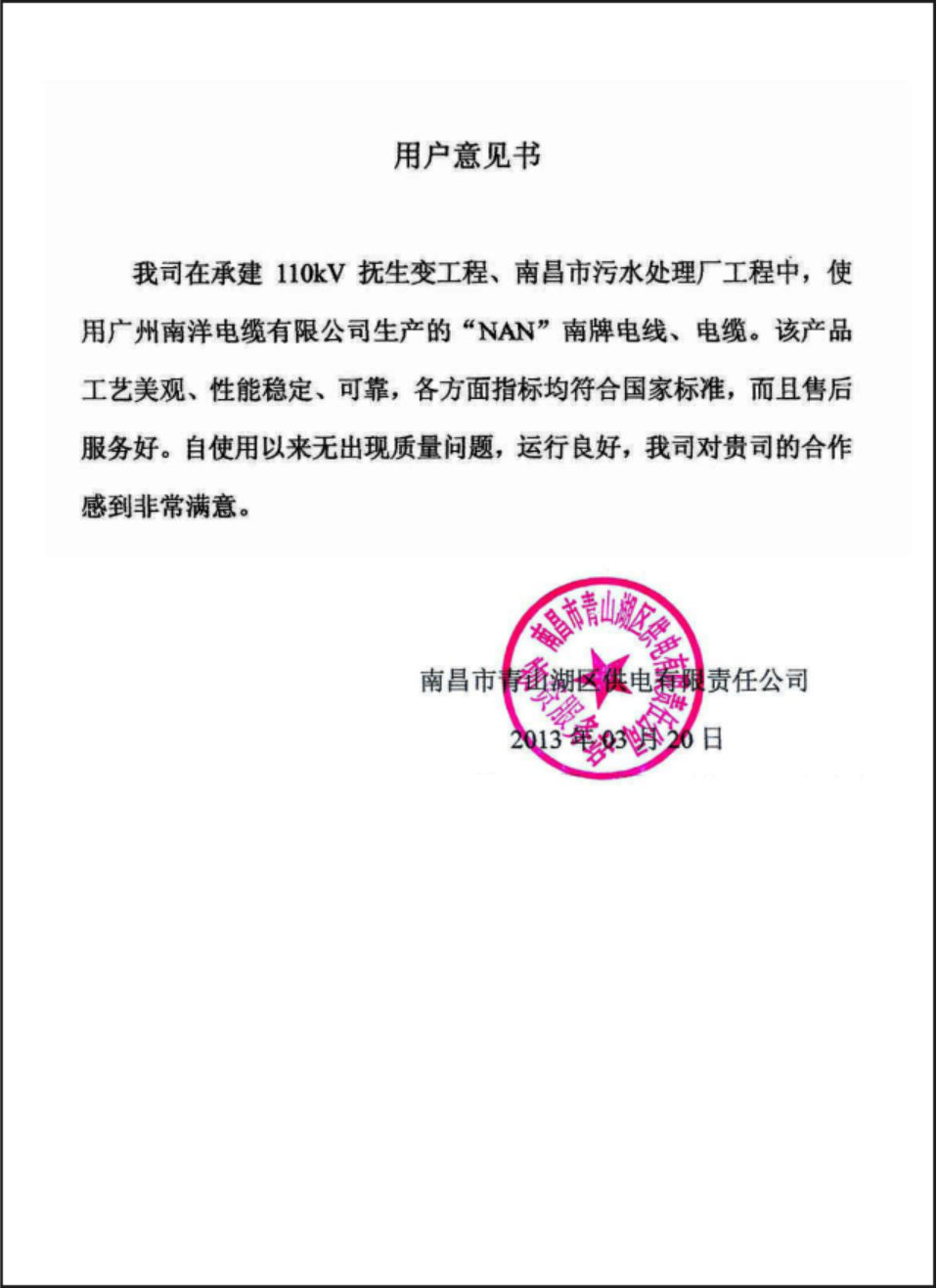 南昌市青山湖区供电公司用户意见书