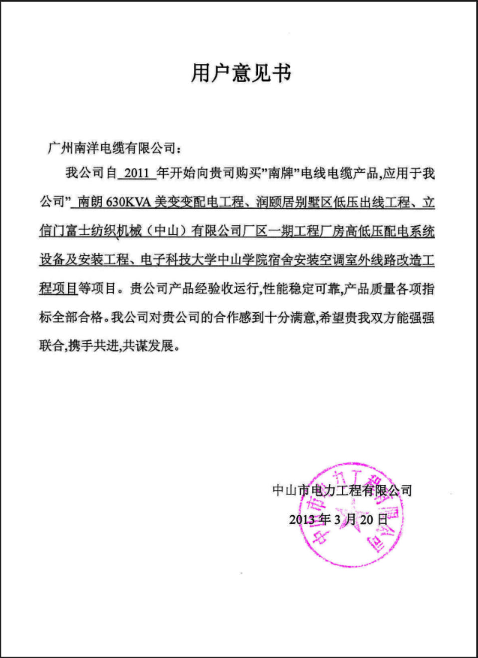 中山电力用户意见书