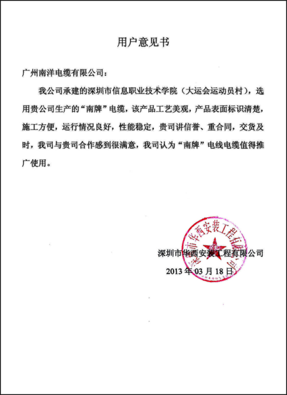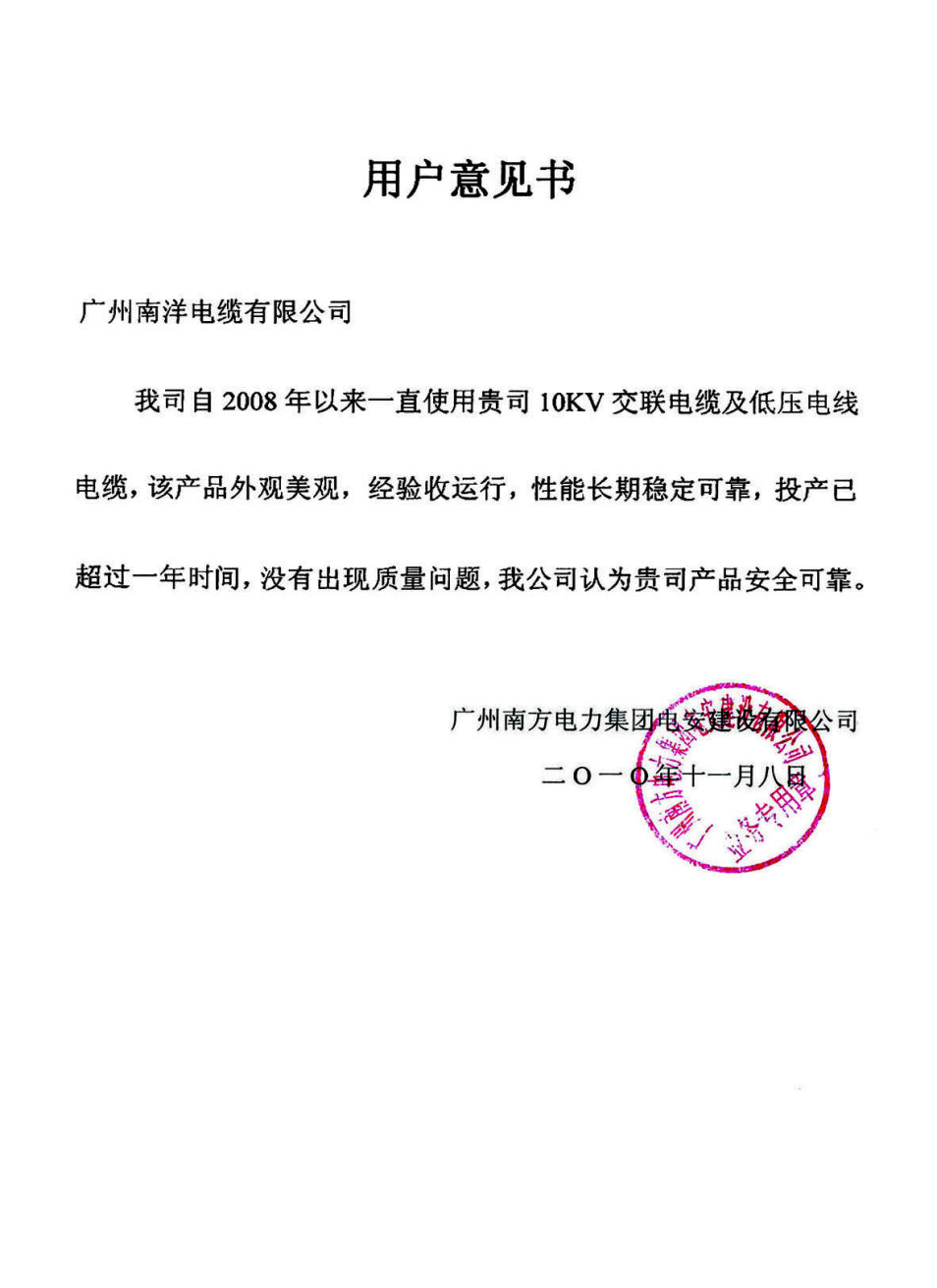 广州南方电建集团用户意见书