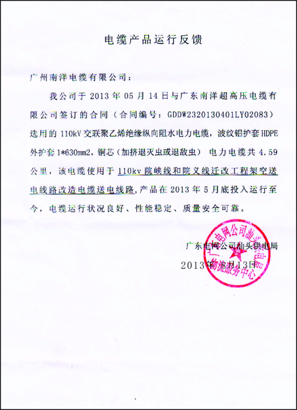 110kv院峡线和院义线迁改工程电缆产品运行反馈