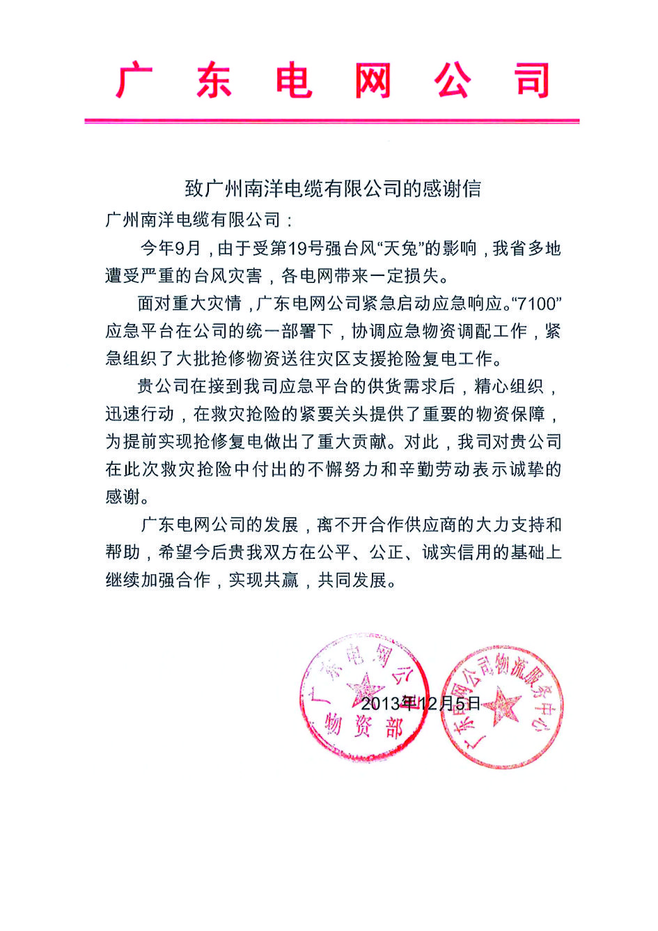 广东电网抗台风感谢信