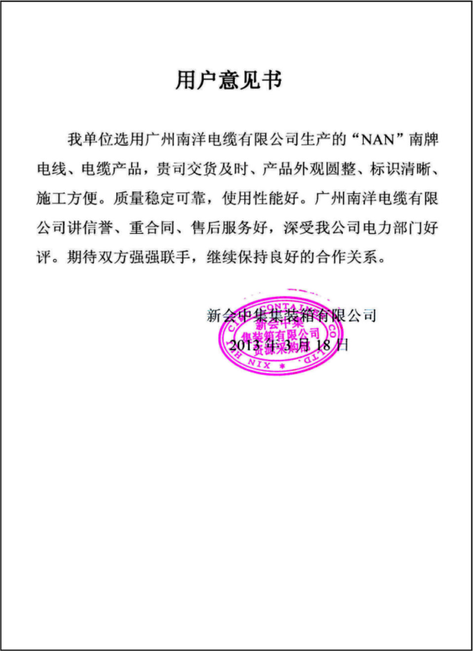 新会中集用户意见书