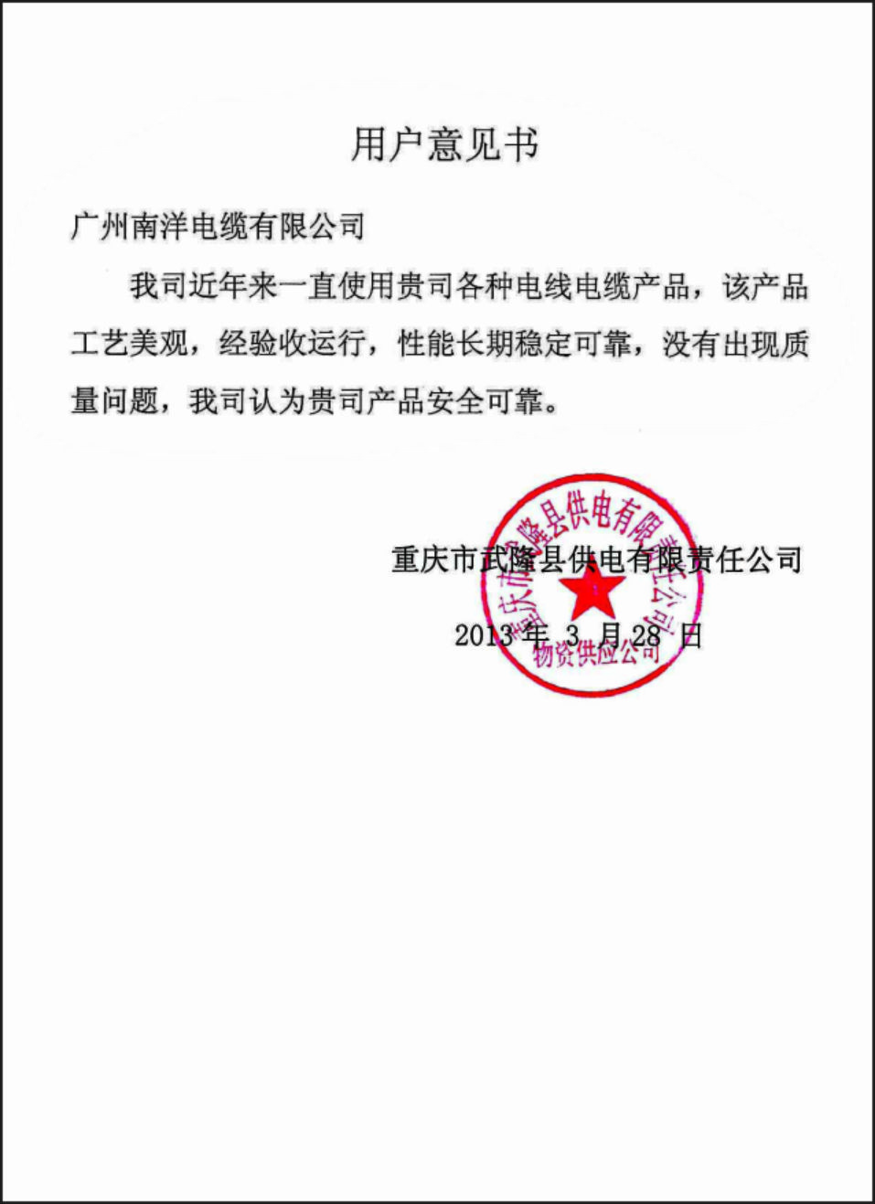 重庆武隆供电公司用户意见书