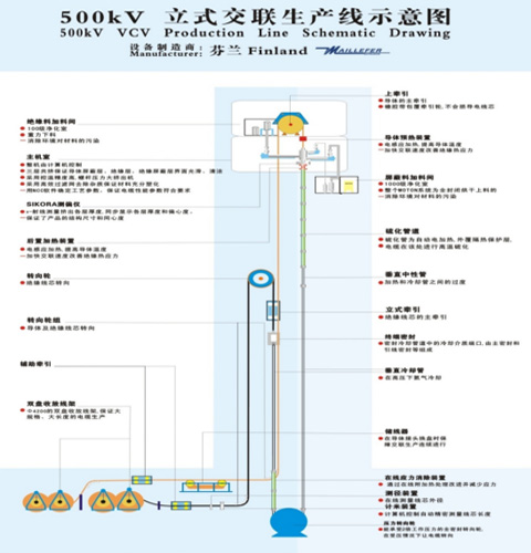 全:整套引进芬兰麦拉菲尔(MAILLEFER)公司500kV立式交联生产线,设备功能齐全,生产线全线由计算机自动控制。设备包括双放装置、放线辅助牵引、储线器、上牵引机、重力下料装置、前置导体预热器、内屏挤出机(60机)、绝缘挤出机(200机)、外屏挤出机(80机)、MOTAN材料处理系统、三层共挤机头、偏心测量仪、后置导体预热器、计算机控制系统、交联管道、中性管道、气水分离器、冷却管道、U型压力回转导轮、在线松弛段、下封闭、下牵引机、电缆测径仪、双收线装置等。