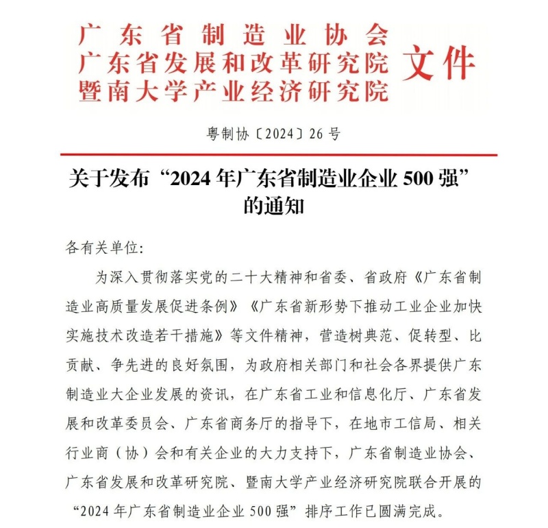 会上发布了2024年广东省制造业500强企业研究报告,同时公布了“2024年广东省制造业企业500强”榜单。研究报告以企业年度营业收入为主要依据,并从上榜企业的整体规模、经营和创新能力、区域分布、行业特征和所有制类型等角度进行分析,报告显示:2024年广东省制造业500强企业营业收入合计达到5.325万亿元,比2023年下降4.9%;但企业净利润总额3339.36亿元,比2023年增加16.56%。广州南洋电缆集团2023年营业总收入72.2亿多元,位居“2024年广东省制造业企业500强”第80位, 排名较上年提升9位。今年公司还连续七年荣获中国线缆产业最具竞争力企业20强,广东线缆产业最具竞争力企业20强第一名,荣获2024年广东企业500强,荣获2024广东制造业民营企业100强。