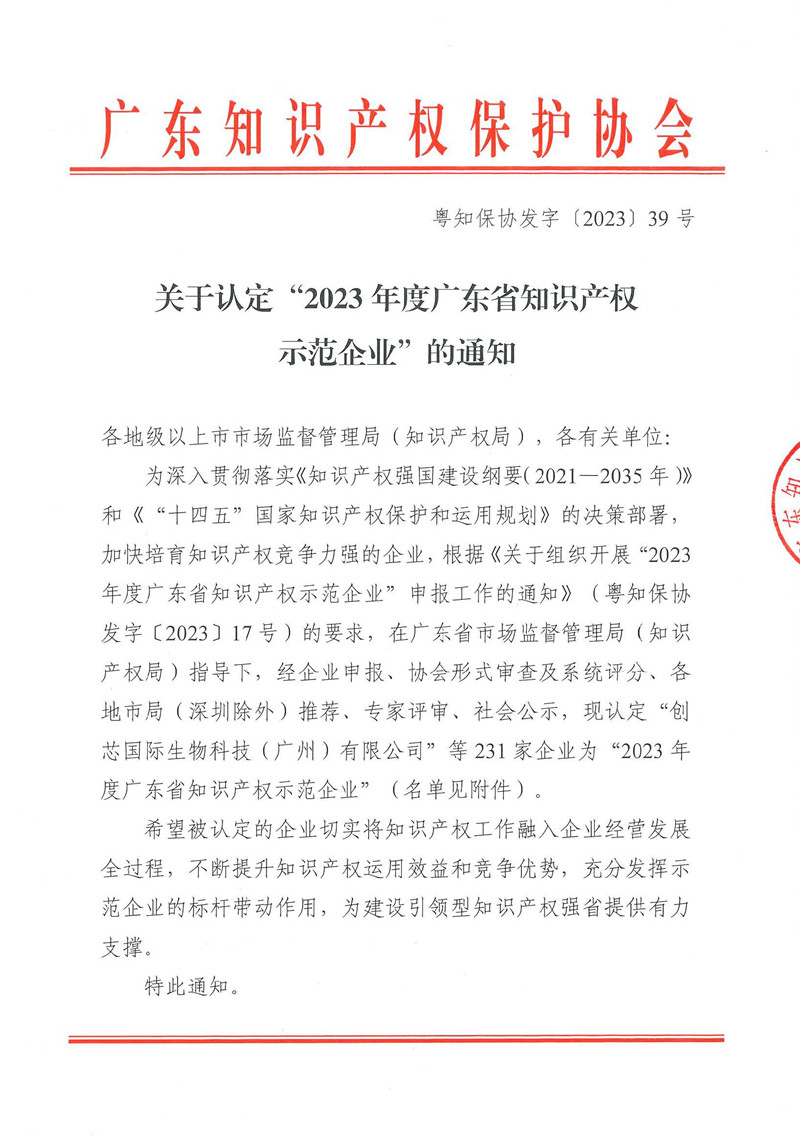 近日,广东知识产权保护协会公布了2023年度广东省知识产权示范企业认定结果。此次评选工作经企业申报、协会形式审查、系统评分及所在地市局推荐,并由评审专家组结合总体评定规模、地区平衡等因素进行综合评审,公司凭借完善的知识产权管理体系、先进的技术创新能力和突出的综合竞争优势,被成功评定为“2023年度广东省知识产权示范企业”。