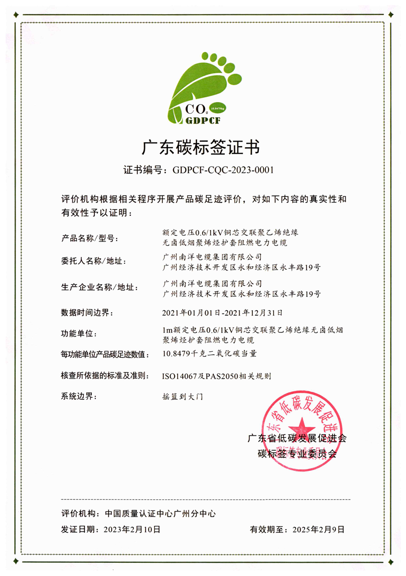 喜讯-广州南洋电缆集团荣获广东碳标签证书